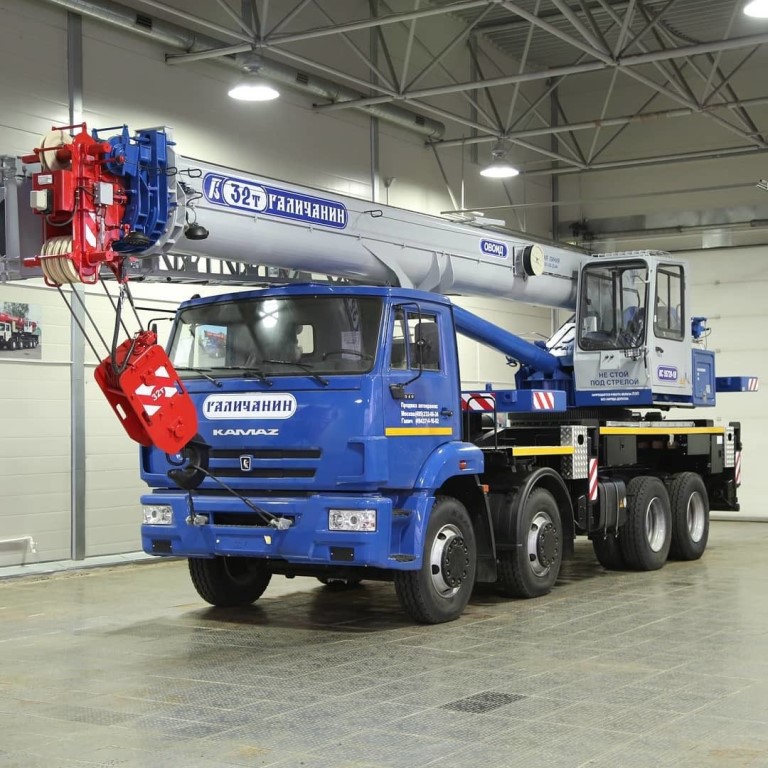 Грузоподъемность 32т, шасси КАМАЗ-6540, стрела 30,2 м., в базовой комплектации противовесы 2,4т. + 2,4 т. (перевозятся в составе крана), гарантия на кран 18 месяцев или 1000 м/ч