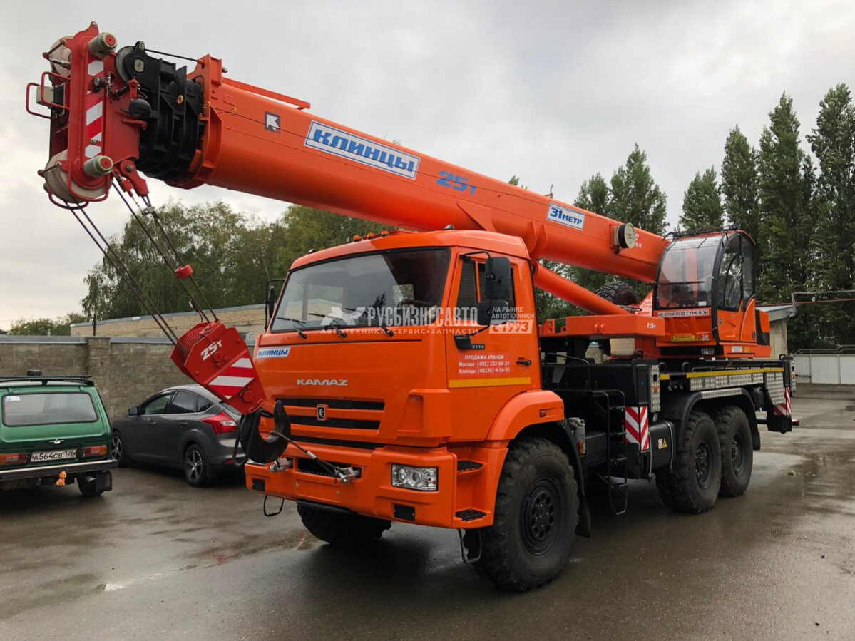 Грузоподъемность 25т, шасси КАМАЗ-43118, стрела 31 м., гарантия на кран 18 месяцев или 1000 м/ч (в базовую комплектацию портал для монтажа противовесов и сами противовесы не входит)