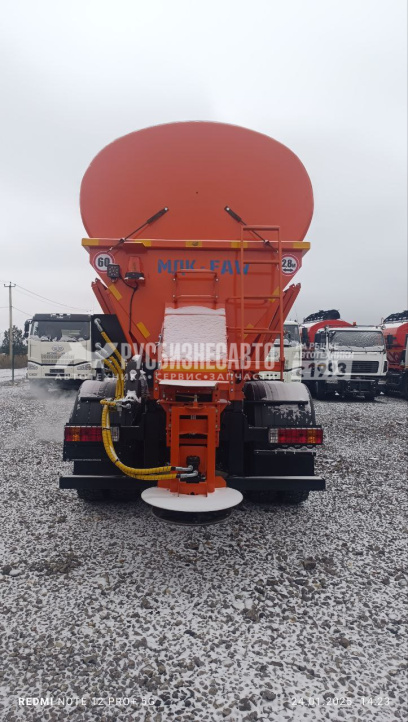 - Кузов бункера объемом 12 куб/м. Материал подающего желоба и разбрасывающего диска: нержавеющая сталь.