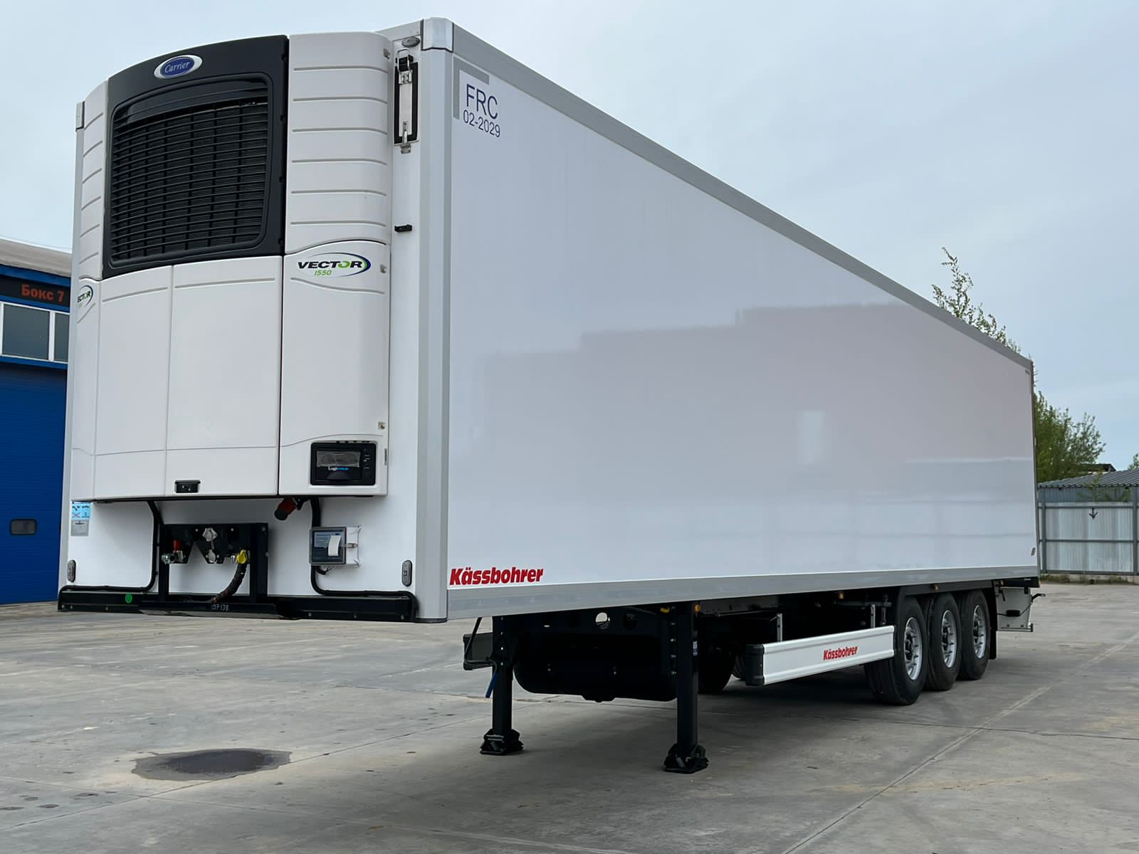 Kassbohrer Frigo полуприцеп Рефрижератор с установкой Carrier 1550 S c регистратором данных DataCold 300 T.  с топливным баком 500 литров, оси BPW с дисковыми тормозами, пердняя подъемная ось, металлический рифленый пол, Задняя панель (Глянцевые GRP панели с внешней стороны, внутренние PU блоки, с внутренней стороны grp панели с глянцевым покрытием и армированием) толщиной 85 mm, GRP "сэндвич" панель со стальной рамой заднего прохода, двойные двери с двойными замками. По 4 петли у каждой двери и по 2 штанге из нержавеющей стали. Вентиляционный лючок на створке ворот.