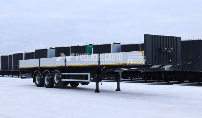 Полуприцеп грузовой (бортовой) трехосный, пол - фанера 27мм., длина 13,6м, первая ось подьемная, барабанные тормоза, рычажная подвеска, ССУ-1200мм, с кониками, 24В.