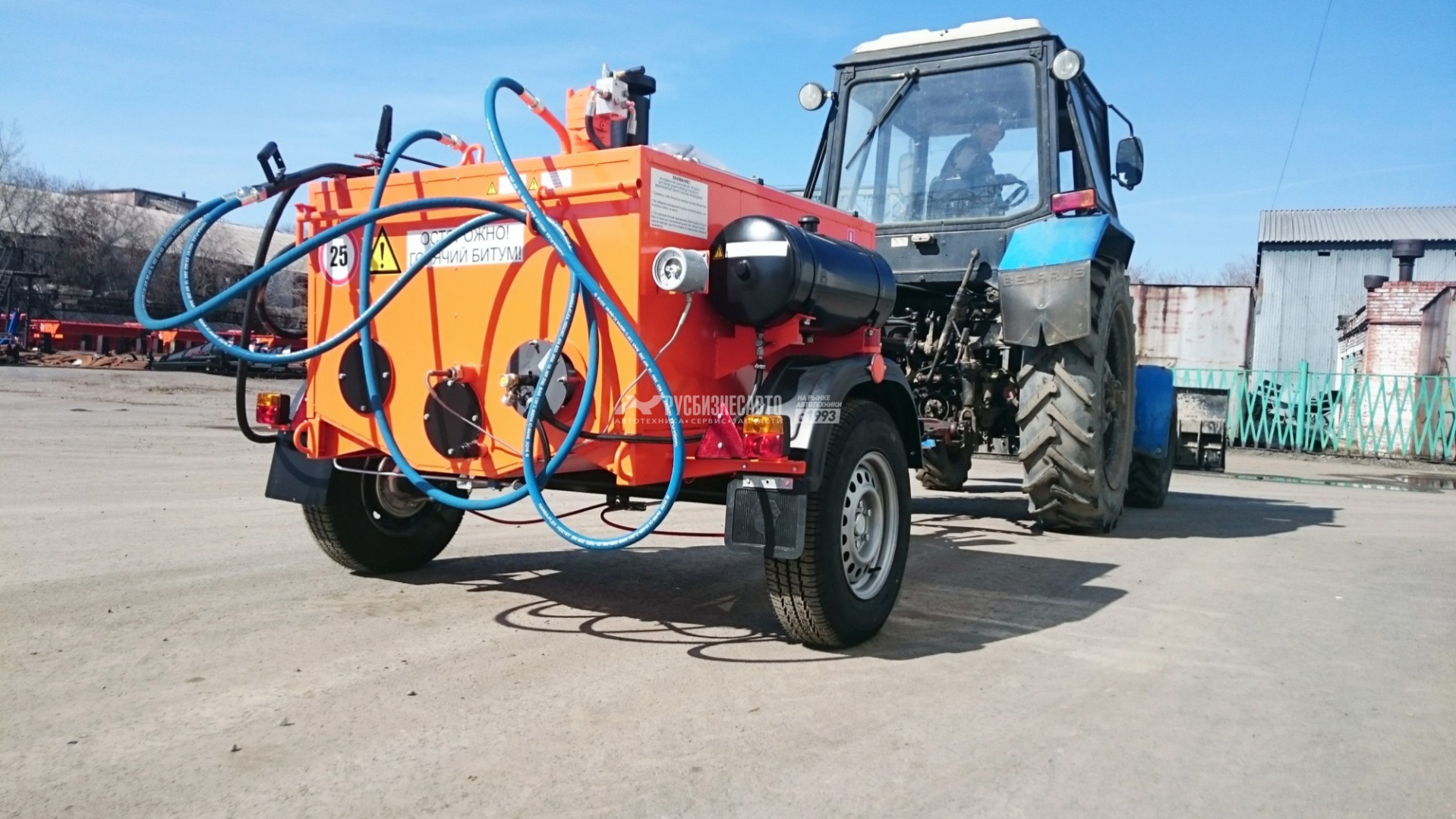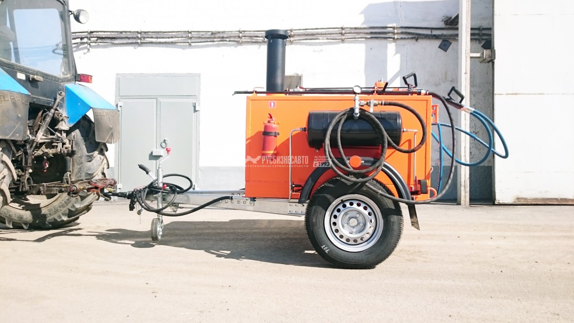 Битумозаливщик БЗ - высокопроизводительное оборудование для санации швов, трещин, а также производства мелкого ремонта асфальтобетонных покрытий, с возможностью подключения пневматического инструмента. Представляет собой тракторный одноосный прицеп с установленной на нем термоизолированной ёмкостью, которая заполняется расплавленным битумом.