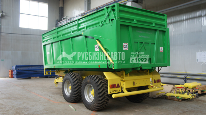 Назначение: Перевозка различных сельскохозяйственных грузов по всем видам дорог и в полевых условиях. Допускается перевозка сыпучих строительных грузов. Свал груза с платформы назад. Полуприцеп предназначен для эксплуатации с колёсными тракторами классов 3,0 — 5,0. Параметры     Значения Масса прицепа, кг, не более     4640 Масса перевозимого груза, кг, не более     15000 Максимальная скорость движения, км/ч     35 Габаритные размеры, мм     (7100x2485x2670) Внутренний размеры кузова, мм, не менее     (5192x2315x1605) Объем кузова, м³     19,3 Погрузочная высота платформы, мм, не более     1460 Ширина колеи, мм     1920 Дорожный просвет, мм, не менее     420 Разгрузка прицепа     назад Рабочее давление в гидросистеме, МПа (кгс/см²)     15(150)-20(200) Рабочая тормозная система     Пневматическая с однопроводным приводом Стояночная тормозная система     Механическая с ручным приводом Электрооборудование     Однопроводная система постоянного тока напряжением 12В с питанием от трактора Шины     500/60R22,5 Угол подъема платформы, град 50